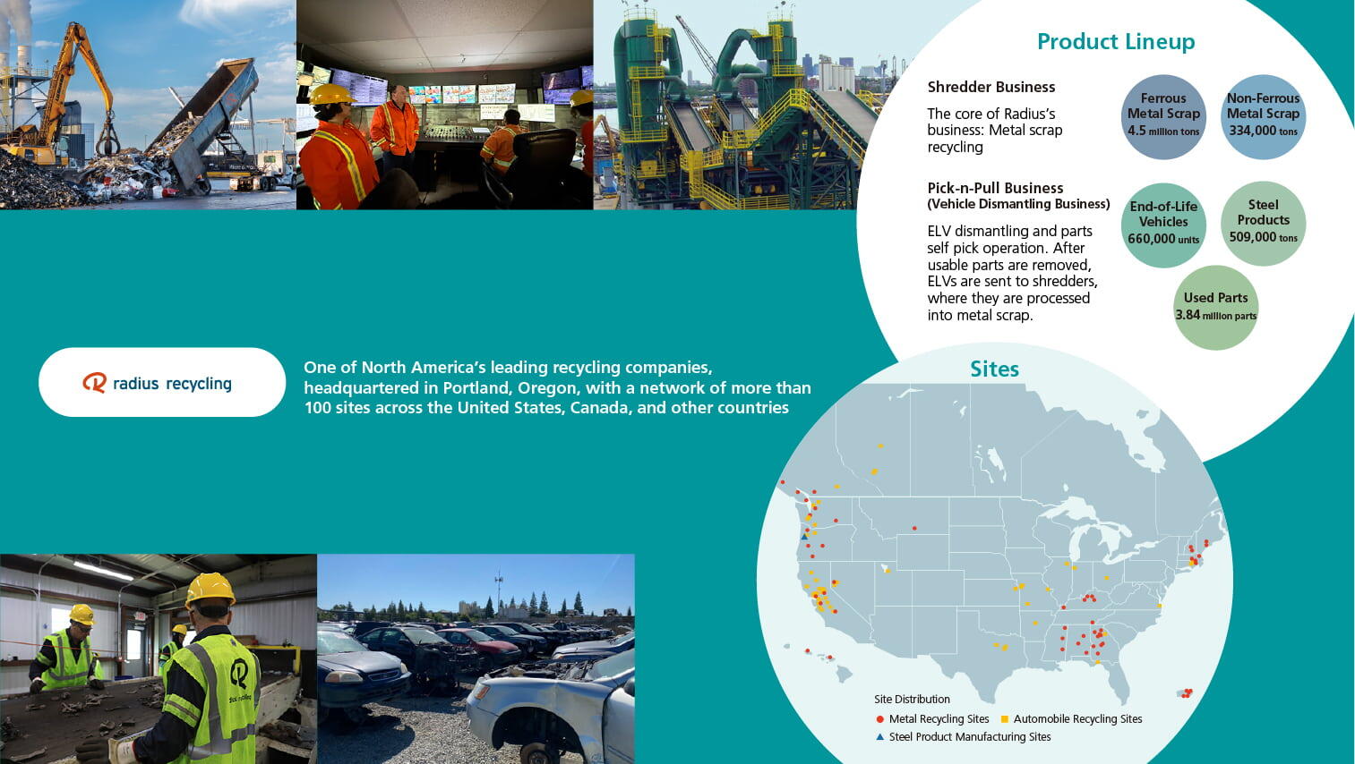 Radius, a long-established company founded in 1906, is one of North America’s foremost recycling businesses, handling approximately 4.8 million tons of scrap each year. Not only collecting, sorting, and processing metal scrap, it also operates Pick-n-Pull upstream—a vehicle dismantling and used parts business—and has firmly established itself as an automotive recycler in the North American market.